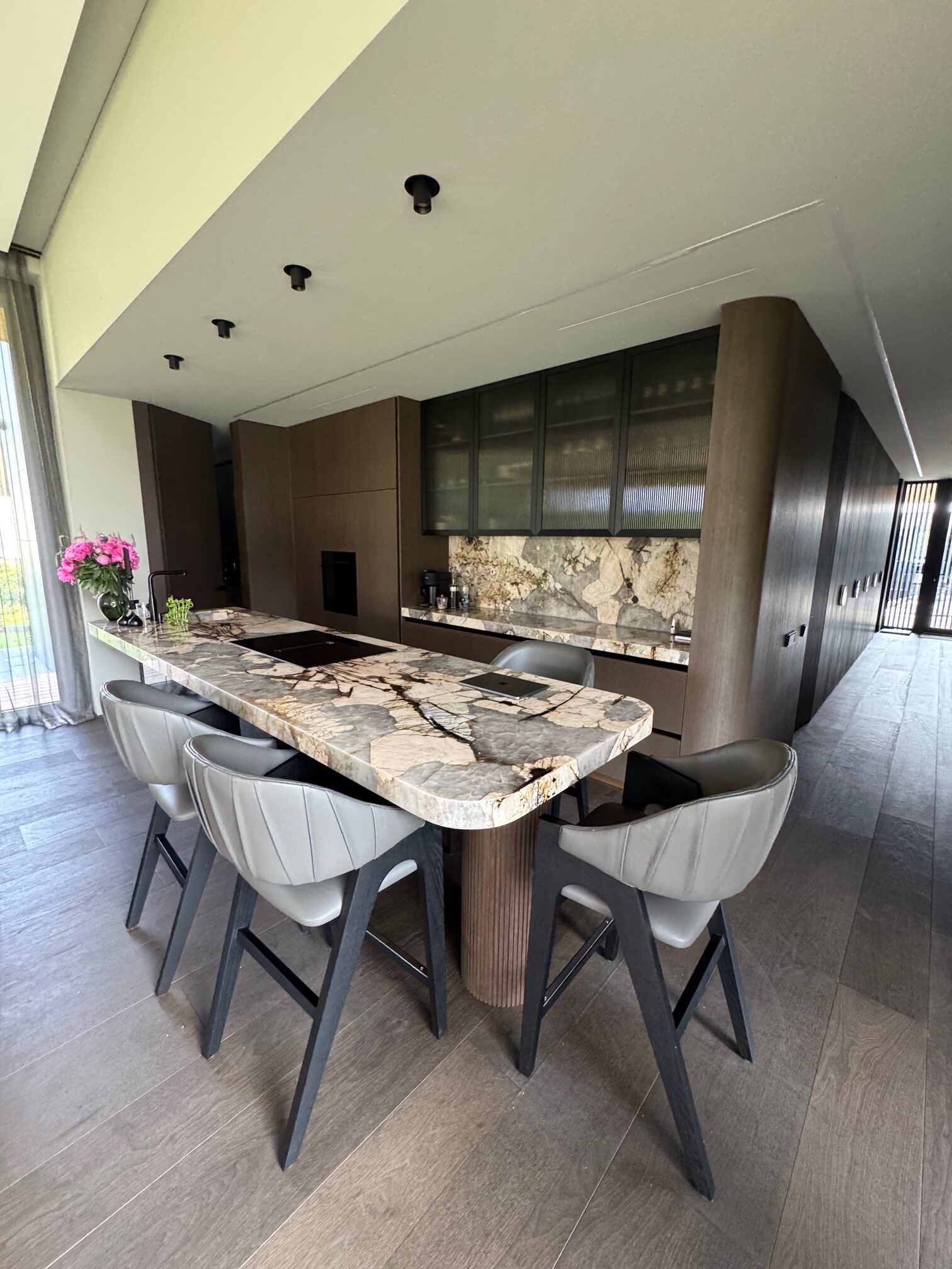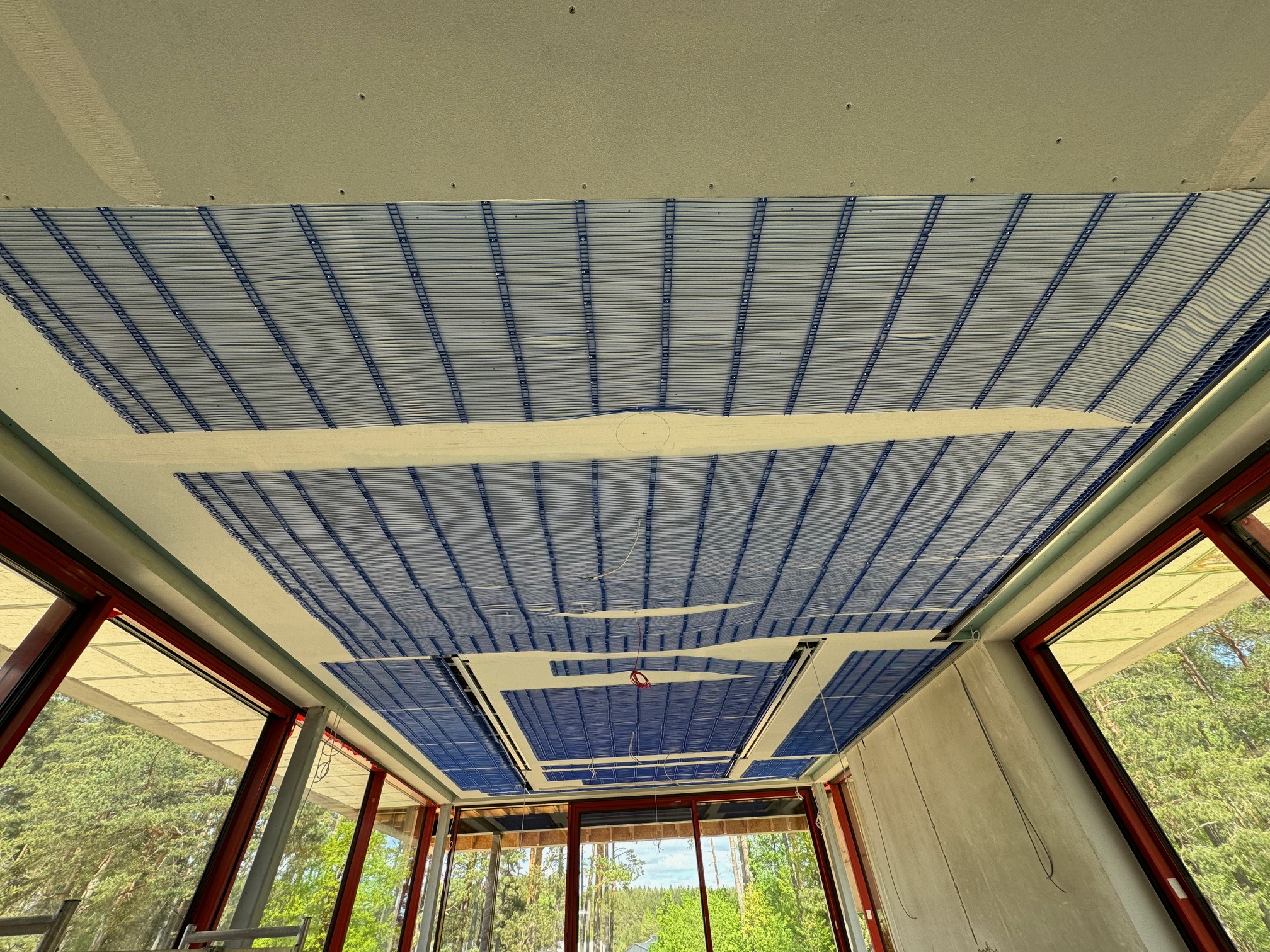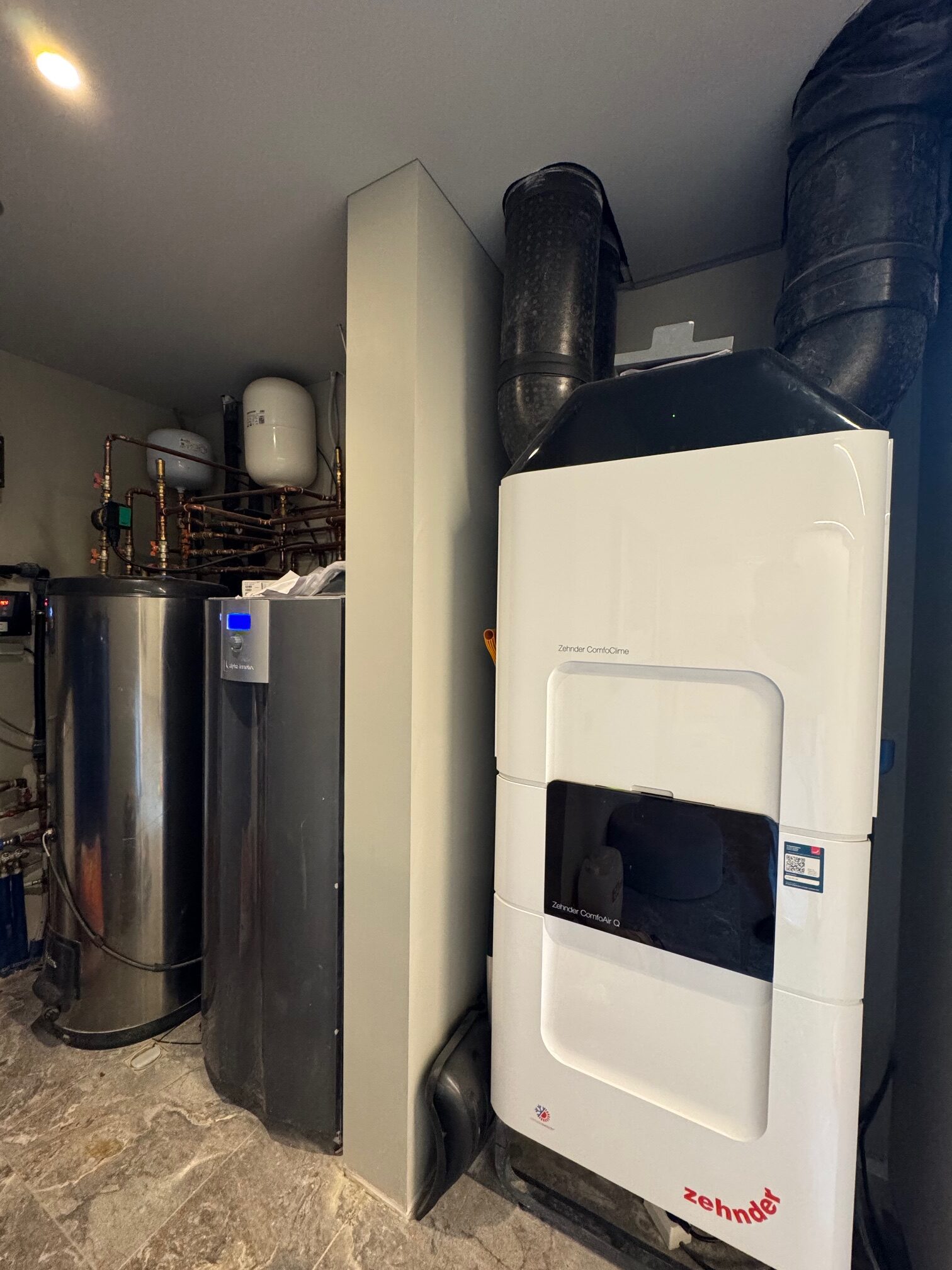 250 m2 gyvenamasis namas su šildomu garažu Vilniuje. Sumontuotas geoterminis 12 kw šilumos siurblys Alpha Inotec šildymui ir vėsinimui. Irengtas lubinis kapiliarinis vėsinimas. Patalpu vėdinimui sumontuotas Zehnder Comfo Air 600 rekuperatorius su Comfoclime moduliu kuris gali papildomai vėsinti ir šildyti. Sumontuoti priglaisomi plšiniai linijiniai difuzoriai.